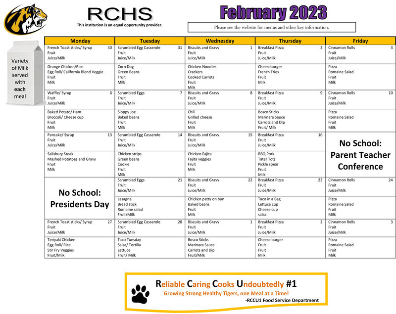 RCHS FEBRUARY 2023 MENU